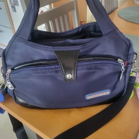 Säädettävällä olkahihnalla siisti ja kevyt laukku, joka huopaa. Koko noin 30 x 36 cm ja paksuus n.8 cm. Logo University of Thessaly. Toimitus Lpr kesk, postitus toridiili.