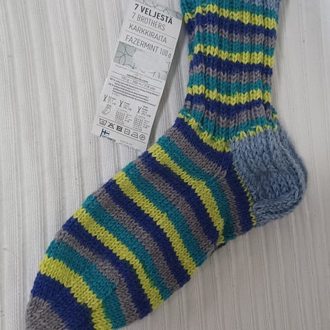 Novita 7 veljestä lanka (Raita), vahvistettu kantapää, uudet. Koko 44-45. Postitus onnistuu. MMM