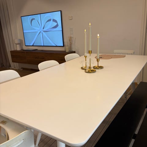 Tukeva kaunis ruokapöytä. Ostettaessa pyökinvärinen pinta, maalattu valkoiseksi. Mitat noin 100x210.tarvittaessa mittaan uudelleen. On varastoituna.