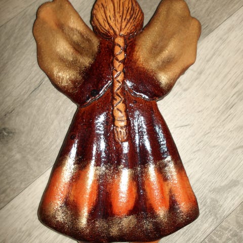 Jotenkin ihan tavattoman hyvin suomalaiseen koti sopiva keramiikka enkeli. Kaunis käsityö-osaamisen näyte. Toisessa ilmoituksessa myynnissä enkeli takaapäin.