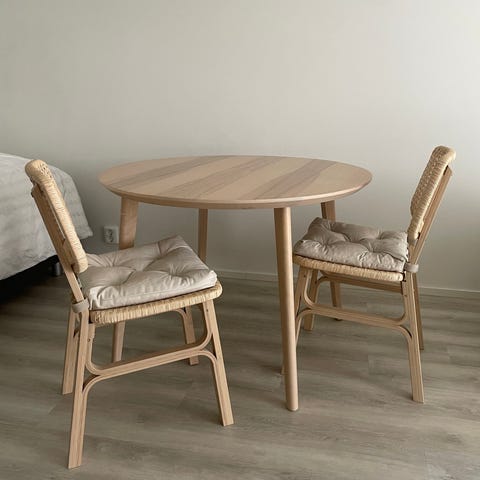 Tuolin mitat: käsinojien leveys 58, syvyys 56 cm, selkänojan korkeus lattiasta 80, istuinkorkeus ilman tyynyä 37 cm.