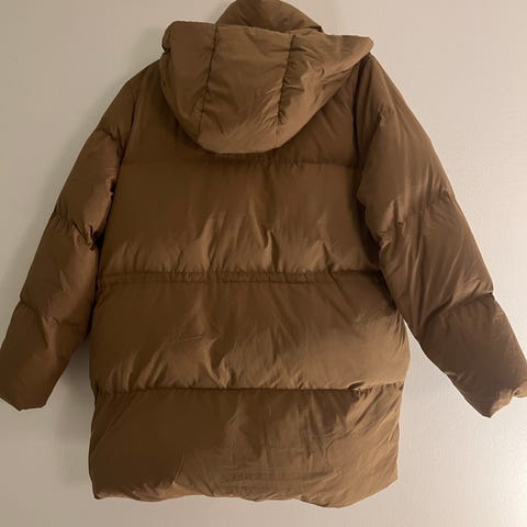 Kaunis ja lämmin untuvatakki. Erittäin hyväkuntoinen, hyvänä pidetty. Pitkältä katsottuna näyttää lähes mustalta. Läheltä näkee kankaan kauniin tekstuurin (tummanharmaa/musta). Kaksisuuntainen vetoketju. Irroitettava huppu, vetoketjulliset taskut.