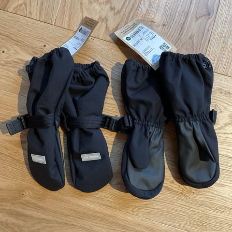 Reima askare lasten hanskat, koko 2 (1-2 vuotiaalle). Väri tumman sininen. Käsineissä on säädettävä ranneosa ja kämmenpuolella vahvistettu materiaali kestävyyden lisäämiseksi. Ollut käytössä yhdellä lapsella. Kunto hyvä, huomioi pieni kuluma oikeassa peukalossa. Välikausi hanskat, ohut vuori kämmen osassa.