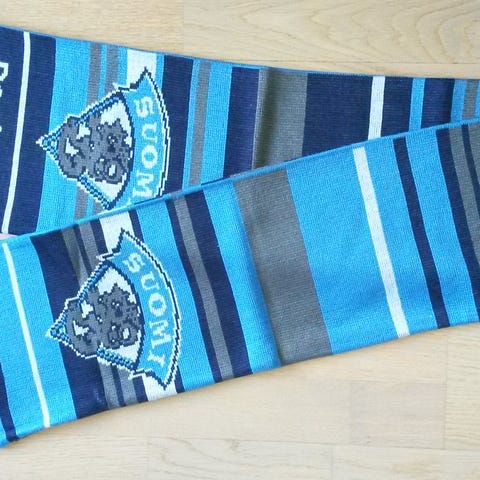 Hockey Fanihuivi Suomi on sinivalkoinen, valmistettu 100% akryylistä. Huivi on käsin pestävä ja valmistettu Portugalissa. Tuotteessa on tupsut päissä ja Suomi-aiheinen kuviointi, sopii käytettäväksi fanihuivina tai asusteena. Huivin pituus 125 cm. Hinta 15 euroa