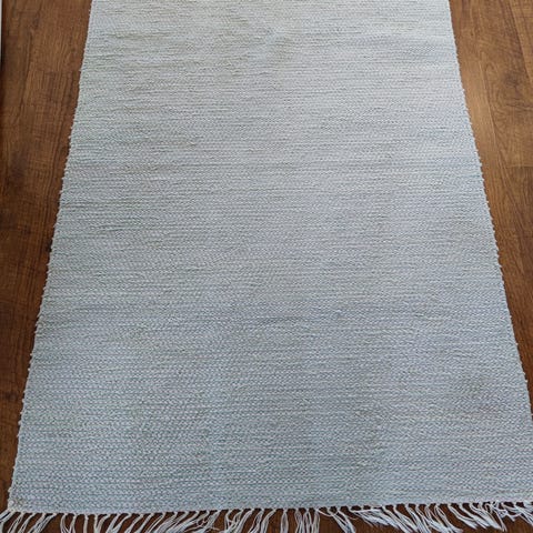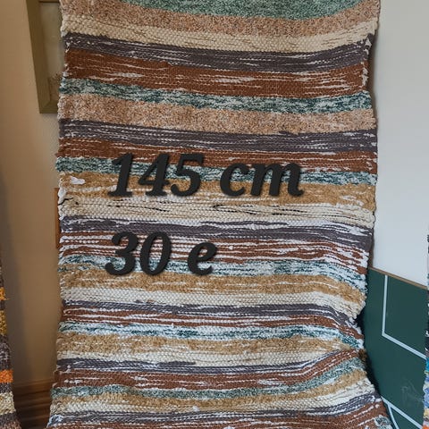 Myytävänä pieni soma matto, joka on kudottu käsin puuvillakuteista. Leveys 86 cm ja pituus ilman hapsuja 108 cm.