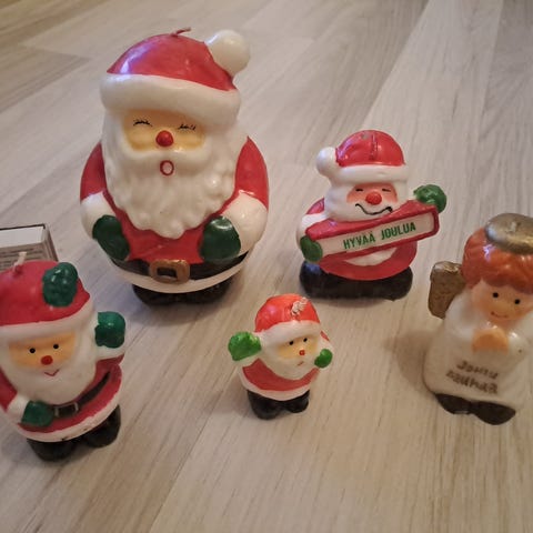 Myydään vanha joulupukki kynttilä. Korkeus 13 senttiä. Muovit päällä, käyttämätön. Alalaidassa metsä ja mökkimaisema kuviointia.