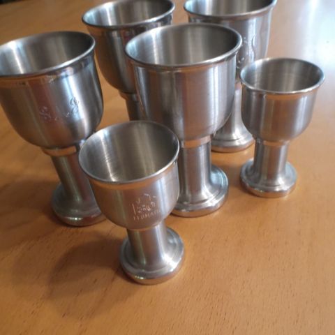 Suomessa valmistettu tinakarahvi sekä 4 pikaria. Karahvin korkeus on 22 cm ja pohjan halkaisija 11 cm, pikarien korkeus on 11 cm ja halkaisija 5,5 cm. Käyttämätön setti.
