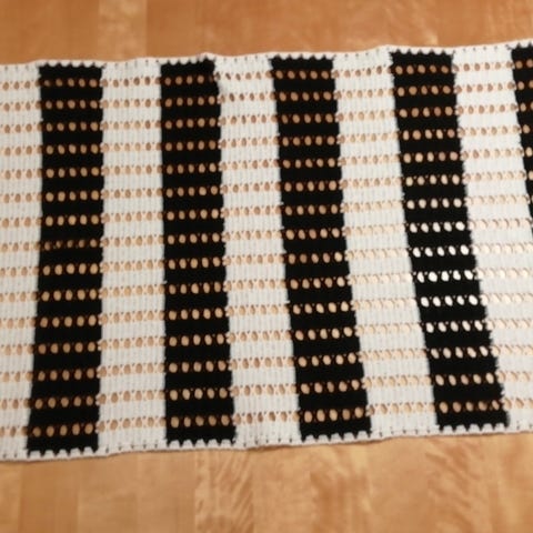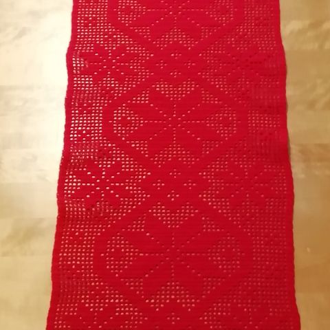 Uusi valkoinen käsin virkattu kaitaliina, koko n. 33 x 123 cm.