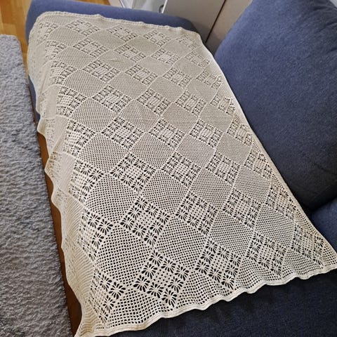 Aitoa käsityötä, käsin kalastajalangasta virkattu kaunis pitsiverho