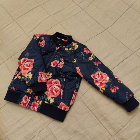 Niskan lapussa sutattu nimimerkintä. Oikealla taskun päällä ja hihassa pienet hankaumajäljet/nukkaantumista ja vasemmalla edessä pieni tahra, joka ei ole pesussa lähtenyt. Virheet kuvissa.