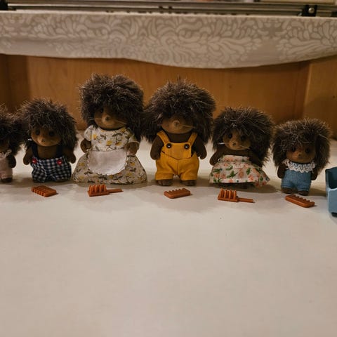 Sylvanian Peura perhe setissä hahmot pukeutuvat yhteneviin kukallisiin asuihin, mikä lisää niiden viehättävyyttä.