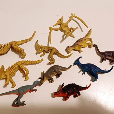 Vanhoja muovisia dinoja, käytettyjä, rakastettuja ja se näkyy, kunto kuitenkin ok. Mieluiten nouto, ovat pikkuisen vaikeita muotonsa puolesta postittaa.
