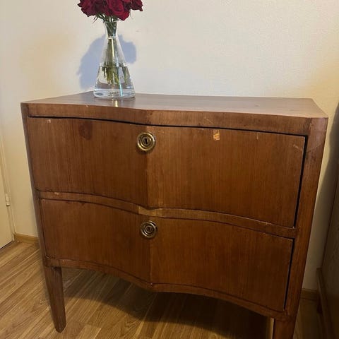 Myytävänä tukeva, täyspuinen, pienikokoinen lipasto, ehkä 50-luvulta. Lipaston yläpinnassa on jonkin verran huomauttamista, mutta vaurio on vain lakkapinnassa. Minulle on kelvannut tähän asti tässä kunnossa. Mielestäni puulaji on koivua. Olen muuttanut pienempään asuntoon ja joudun siksi luopumaan. Itselläni tämä palveli eteisen pöytänä, sopisi myös yöpöydäksi. Tämän pienen monikäyttöisen kaapin voi noutaa Pakilasta.