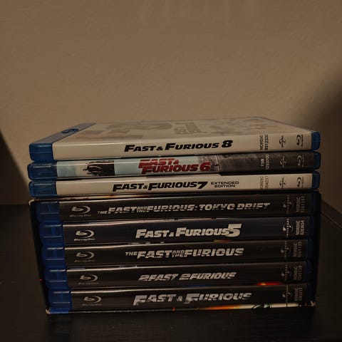 5kpl Fast & Furious elokuvia kaikki kerralla. Kuvasta selviää mitkä elokuvat kyseessä.