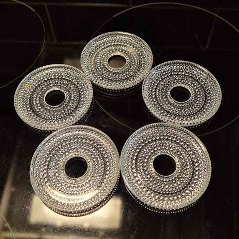 Iittala Kastehelmi -sarjan lautaset ja kulho, valmistettu vihreästä lasista. Setti sisältää useita eri kokoisia lautasia ja yhden kulhon. Tuotteet on koristeltu kohokuvioidulla pisaramaisella pinnalla, joka on tunnusomainen Kastehelmi-sarjalle.Ison lautasen pohjasta 1 nappula pois. Kuvassa näkyy.