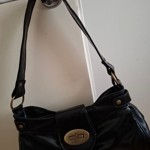 Musta keinonahkainen pikkulaukku irrotettavalla olkahihnalla. Koko 16cm x 21,5cm. Täysin käyttämätön 💛
