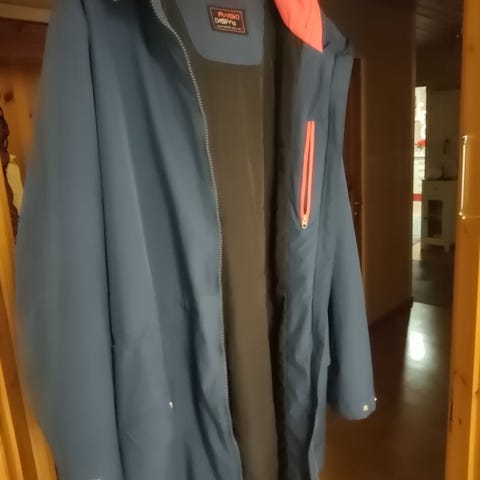 Naisten tummansininen Raiskin kunnon talvitakki, koko D40. Pitää tuulta, vettä, hengittää, paljon vetoketjuja mitä saa auki, esim sivuilla. Karvan ja hupun saa pois. Uudenveroinen, vaikea saada oikea väri kuvaan kun huono kamera. Maksanut noin 160e.