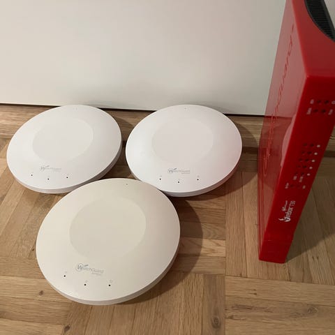 Myynnissä toimiva Watchguard T80 palomuuri, muuntaja ja virtajohto.