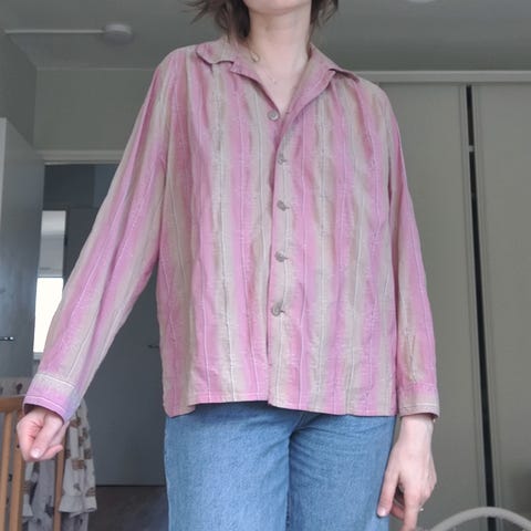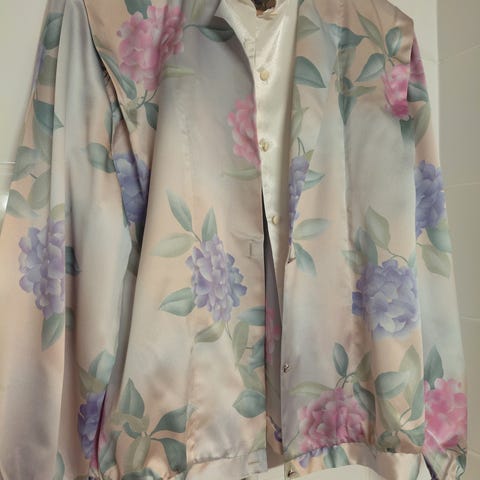 Napitettava väljä satiinipaita, valmistettu Suomessa, vintagea Sataneule. Lapussa koko 40. Sopii ainakin 36-40 / S-L.