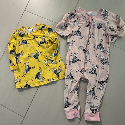 Kuvanmukaiset muumivaatteet koossa 80. Paketti sisältää muumiyökkärin, muumibodyn, muumimekon (koko 86, mutta mielestäni lähempänä kokoa 80) ja muumibodymekon. Ehjä kuvanmukainen käytetty kunto, vaatteissa hieman nukkaa ja mekossa muutama suht huomaamaton tahra (ks. vika kuva). Vaatteiden käytetty kunto huomioitu hinnassa. :)