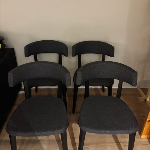 Yhden tuolin istuinosassa on tumma tahra. Saattaa lähteä irti tekstiilipesurilla.
