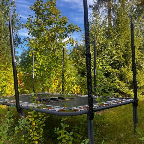 Ostettu käytettynä, uusittu matto ja jouset pari vuotta sitten, hyvässä kunnossa. Edellinen omistaja ommellut turvaverkkoon tarrat paremmin kiinni niin pysyy paikoillaan. Tällä hetkellä purettuna osiin talvea varten. Myydään koska ei enää käyttöä.