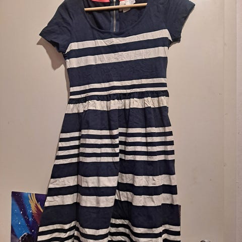 Naisten tavallinen raidallinen mekko. Mekko on hihaton. Mekko on kokoa XS. Mekon raidat ovat siniset ja mekon takapuolella on vetoketju.