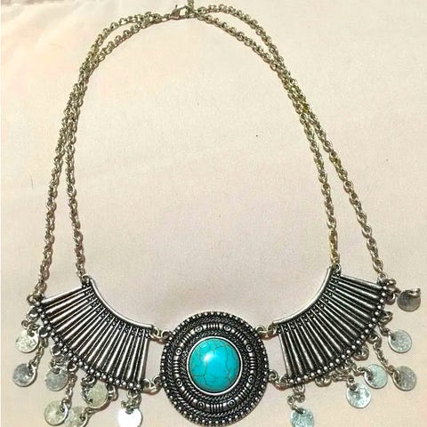 Turkoosikivi kaulakoru, pituus 43cm. Kiven koko 5,5x3,5cm. Postitetaan tarvittaessa.