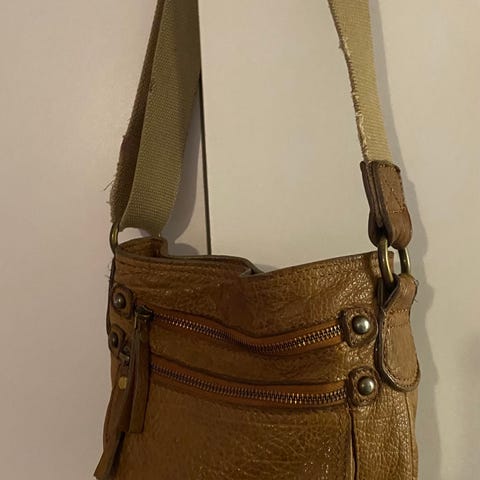 100% nahkaa, kaksi hihnaa joista pidempi irroitettava (tämän pituus 110cm). Sisällä vetoketjutasku ja kaksi avointa taskua. Kultaiset metalliosat ja logo. Metalliosissa hieman kulumaa, nahka paikoin pehmentynyt, väri hieman haalistunut ja kiiltoa hävinnyt. Pohjan kulmissa näkyvimmät kulumat, sekä toisen hihnan yksi sauma irvistää - katso kaikki kuvat. Yleisilmeeltään siisti laukku, sisäosan kangas myös ehjä ja puhdas. Tilava laukku, mitat ~ 44x30.