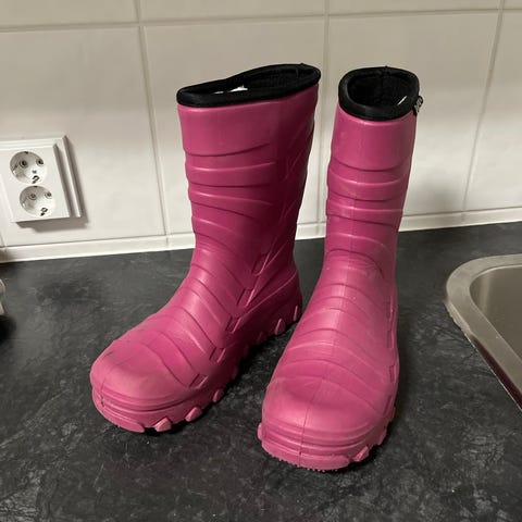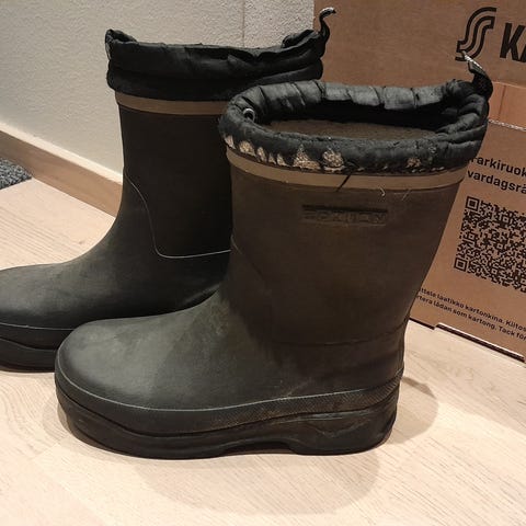 Annetaan Nokian lämpökumisaappaat. Vuoren takasaumassa reikä, jonka viitseliäs korjaa. Muuten saappaat ok kunnossa ja pitävät vettä.