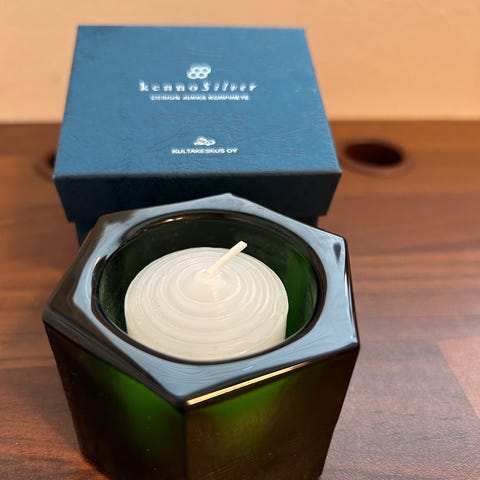 Muurlan greige kynttiläalusta tuikulle tai kapealle pilarikynttilälle, design Risto Matti Ratia. Valkoinen samanlainen myynnissä omana ilmoituksena.