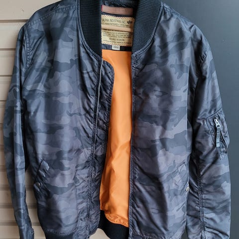 Alpha Industries bomber takki Tebianin logoilla ja merkeillä.