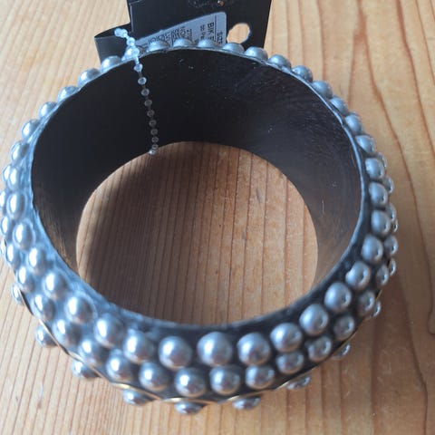 Ei käytetty siis Uudenveroinen musta neljällä pyramidikoristeella kiinnitetty niittiranneke,jossa kiinnitys neppareilla.
