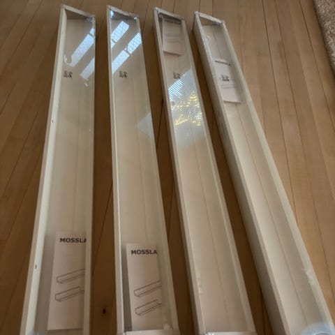 IKEA:n Mosslanda tauluhyllyt (2kpl). Haluat varmaankin, että lempiesineesi ovat näkyvillä. Tällä hyllyllä voit esitellä maalauksia, valokuvia ja muita esineitä. Voit asentaa seinälle useita hyllyjä ja luoda kokonaisen taiteen ja muistojen seinän. Siistit. Toisen hyllyn pohjassa koukku jossa roikkunut milloin mitäkin.