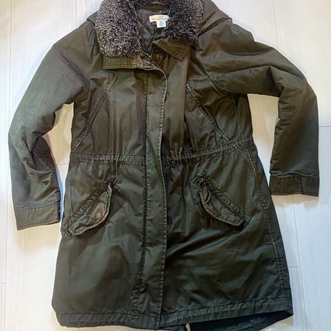 Nätti Elloksen täysin puuvillainen välikausitakki. Edessä vetoketju ja napitus, vyötäröä saa säädettyä nauhalla, samoin hupun kireyttä. Ei tahroja tai tummumaa, hyvä kunto. Koko 40 vastaa kokoa L hyvin, väljähkö takki. Kai-kai 60cm ja pituus takaa 82cm. On hieman pidempi takaa. Haku Tre tai postitus.