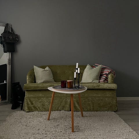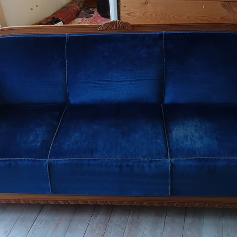 Myydään muuton alta ihana vihreä samettisohva, jossa ruusut kirjailut ja tummat puuosat. Sohva on jämäkkä, ollut kissakodissa.