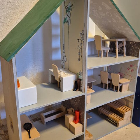 Siistikuntoinen tuunattu nukkekoti, kalusteet kiinteät.