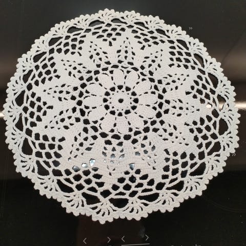 Valkeasta puuvillalangasta käsin virkattu pöytäliina