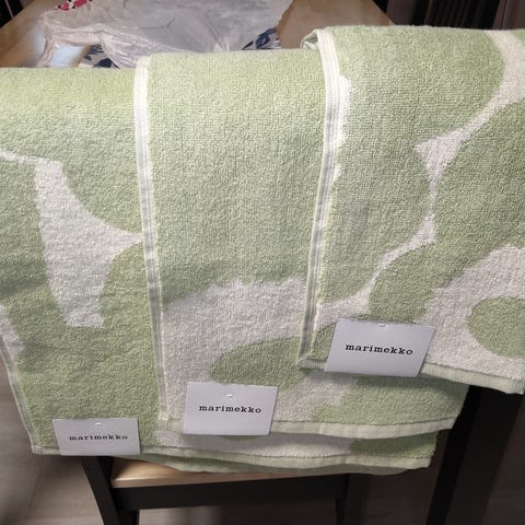 Käyttämättömäksi jääneet Marimekon Satula-kuvioiset keittiöpyyhkeet.