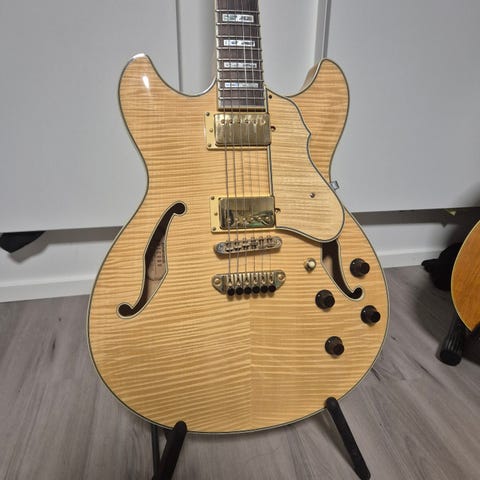 Legendaarinen kitaranrakentaja Dean Zelinsky on aina saanut maineensa kitaranrakennuksen taiteen siirtämisestä seuraavalle tasolle. Uutta CNC-tekniikkaa yhdistettynä vanhan maailman käsivaluun, koristeelliset metallivalut ovat laadukkaita, yksityiskohtia ja viimeisteltyjä. Harvinainen, laadukas, tyylikäs, vähän soitettu ja todella hyväkuntoinen DBZ Bolero Banneret. Banneret on Bolero-sarjan huippu, lippulaiva. Tätä mallia ei ole nykyään myynnissä. Banneretissa on kullatut laitteistot, Grover-virittimet, mahonki-rungon päällä on veistetty vaahterakorkki, Eebenpuu otelauta, Banneretin Tune-o-matic -silta on yhdistetty takana olevaan stoptailibaariin. Mikit ovat DBZ: n tekemiä ja ne ovat vakiona H / H-kokoonpanossa. Kitara on huollatettu ammattilaisella ja on paremmissa säädöissä kuin tehtaalta tullut. Kevyt soittaa 11/52- kielisarjalla. In addition to the new inlay, standard features of the Bolero Banneret include:* 24.75” Set neck * Mahogany/Maple bodies * Mahogany neck/Ebony fingerboards * 22 frets * Premier inlays * DBZ pick ups * Volume and Tone controls * Pick up selector * Coil tapping * Grover tuners * Chrome hardware * DBZ custom casted Stop Tail piece bridge. Mukaan kitaralle sopiva laadukas kova laukku ja leveä nahkahihna. Nouto tai toridiili tai lähetys matkahuollon kautta hyvin pakattuna lähipakettina. Ei vaihtoja! Kysy tarkemmin! Tervetuloa koesoittamaan!
