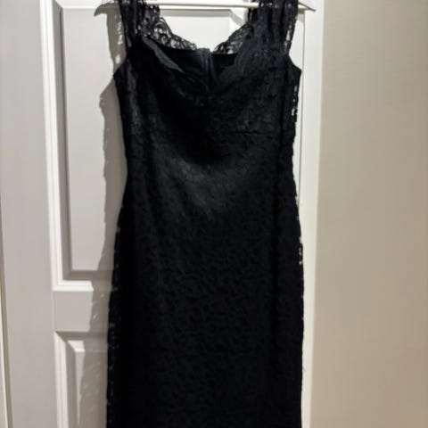 Tom Taylor merkkinen mekko myynnissä. Kevyet, 3/4 mittaiset pitsihihat, pitsi jatkuu mekon yläosaan kankaan päälle, alaosa mekosta suora, ilman päälystepitsiä.