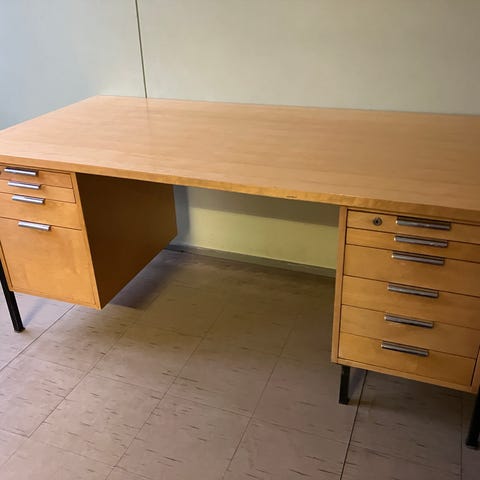 Puinen kirjoituspöytä, jossa taitettava kansi ja useita pieniä lokeroita. Pöydässä on myös vetolaatikoita ja koristeellisia yksityiskohtia. Sopii esimerkiksi työ- tai opiskelukäyttöön. Mitat ovat noin mittoja, tarkat mitat tietenkin saatavissa jos kiinnostuit. Nähtävillä Turusta 45km.