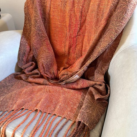 Kaunis vahva ja kantokykyinen, mutta kuitenkin hellä hartioille. Pidemmästä pätkäisty. Kesyyntynyt kivan pehmeäksi ja helposti sitoutuva. Käsinpesu 30 asteessa.