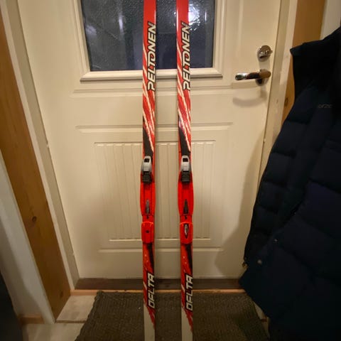 Sukset, väri vaaleanpunainen. Nouto virenoja. Käytetyt mutta varmasti vielä hiihtelee kun voitelee pohjat.