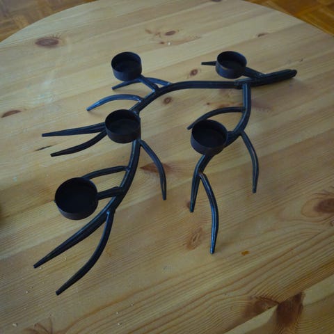 Musta rautainen kynttelikkö. Yhdestä tuikkukupista pieni pala lähtenyt(kuva siitä) muuten hyvä kuntoinen. Nouto petoselta ja maksu käteisellä tai mobilepaylla.
