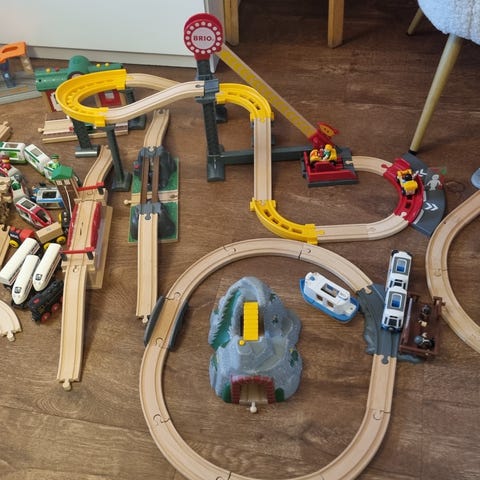 Myydään suuri junaratasetti. Brioa, mutta mukana myös Ikean ja Bilteman osia. Kaikki sopivat yhteen. Yli 100 osaa, ml. Brion kauko-ohjattava veturi ja Brion paloauto-juna ääni- ja valotoiminnoilla (alhaalla vasemmalla), nostosilta, tunneli, vaihteita, satama, juna-asema ja tietenkin paljon rataosia. Näillä rakentaa pitkän ja kiemurtelevan radan, leikki ei lopu kesken. Mukana myös muita vetureita, mutta paristokäyttöiset vihreä ja punainen eivät enää toimi (alhaalla oikealla). Kunnon saa katsoa itse ennen ostopäätöstä.