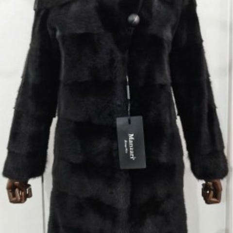Täysin uusi italialainen minkkitakki, valmistettu kokonaisista vaakasuoraan asetetuista nahoista. Syvän sininen sävy mustilla vivahteilla. Suora leikkaus, nappikiinnitys ja tyylikäs huivikaulus laakereilla. Ajaton eleganssi ja lämmin mukavuus.