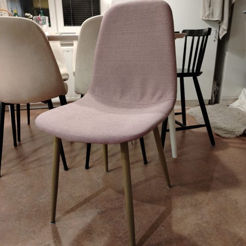 Ruokapöydän tuoli, jossa pehmustettu istuin ja selkänoja, verhoiltu hiekanvärisellä kankaalla. Mustat teräsjalat.