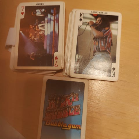 Myydään pelikorttipakka kahdella jokereilla. Kuvissa bändejä ja laulajia. Esim. Tina Turner, Dire Strais, Billy Idol jne