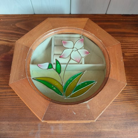 Pieni kauniisti käsin koristeltu, puinen rasia koruille tai muille aarteille.